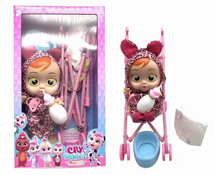 14寸搪胶哭泣娃娃会喝水真流眼泪带四声音乐DAD .Mother.Angry.Cry粉豹纹款带大号手推车带单奶瓶奶嘴水盆尿不湿