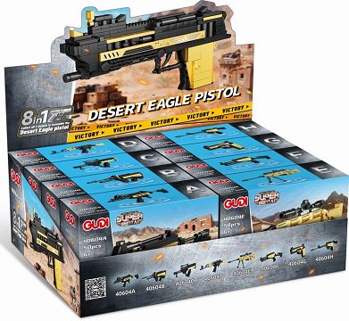 沙漠之鹰枪支组合(8款)40604A-G36C突击步枪(50pcs) 40604B-AUG突击(51pcs) 40604C-GROZA突击步枪(50pcs) 40604D-AKM突击步枪(41pcs) 40604E-AWM狙击枪(58pcs) 40604F-野牛冲锋枪(48pcs) 40604G-P92手枪 (41pcs) 40604H-SLR射手步枪(45pcs)