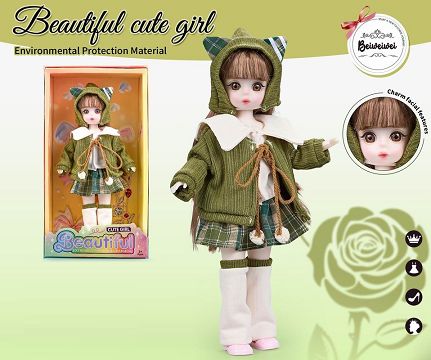 【英文】12寸 30厘米 13关节 实身 3D漫画眼时尚卡通戴绿帽子萝莉娃娃