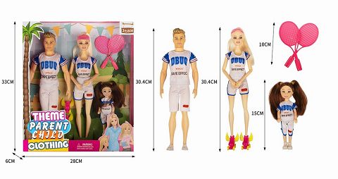 主题公园亲子装系列11.5寸9关节实身女人芭比亲子装一家三口带溜冰鞋。羽毛杆
