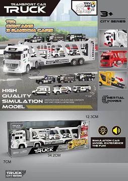 高品质仿真模型双层警车运输卡车 (带声光音乐包电AG13 3粒) 随机配3只车
