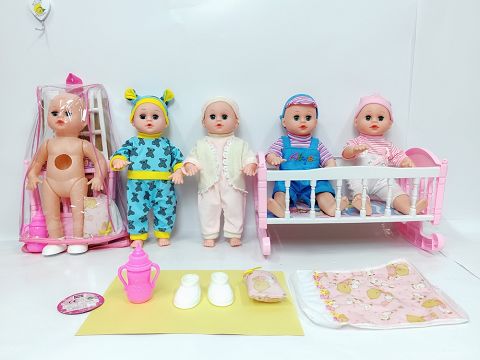 14寸吹气直脚喝水撒尿男娃(带英文IC,一双鞋子,奶瓶,塑料摇床和枕头被)