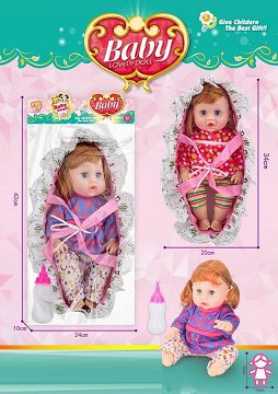 14寸吹气直脚喝水撒尿女娃(带英文IC,一双鞋子,奶瓶,塑料摇床,枕头被)