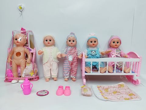14寸吹气直脚喝水撒尿女娃(带英文IC,一双鞋子,奶瓶,塑料摇床,枕头被)