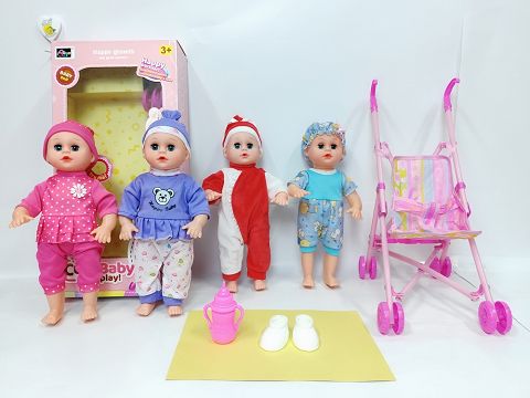 14寸直脚喝水撒尿娃娃带英文IC(配鞋子,奶瓶,塑料摇床,枕头被)