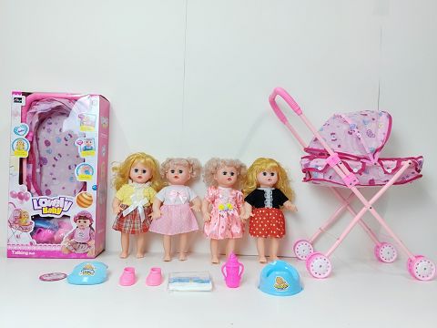 14寸直脚喝水撒尿娃娃带英文IC(配铁推车,围脖,鞋子,尿布,奶瓶,便盆)