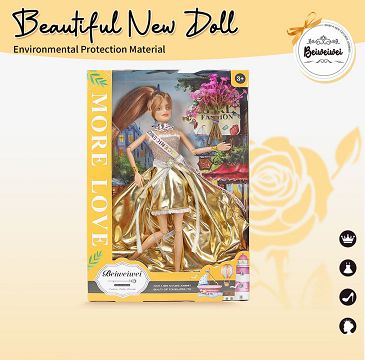 【Beiweiwei】11寸11关节 实身彩印眼时尚精美金礼服芭比娃娃+花束
